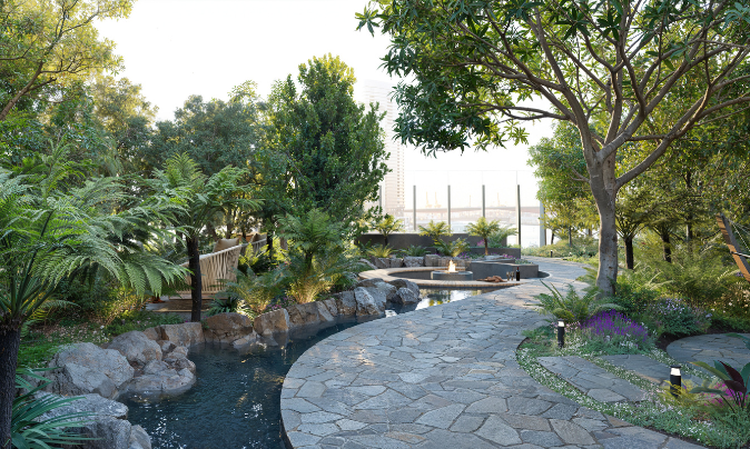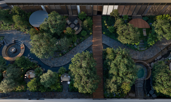 A verdant urban rainforest flourishing seven storeys above the Yarra’s Edge promenade, with a running stream flowing through its centre, the wilderness of The Oasis delivers an instant dose of transportive calm and reprieve.