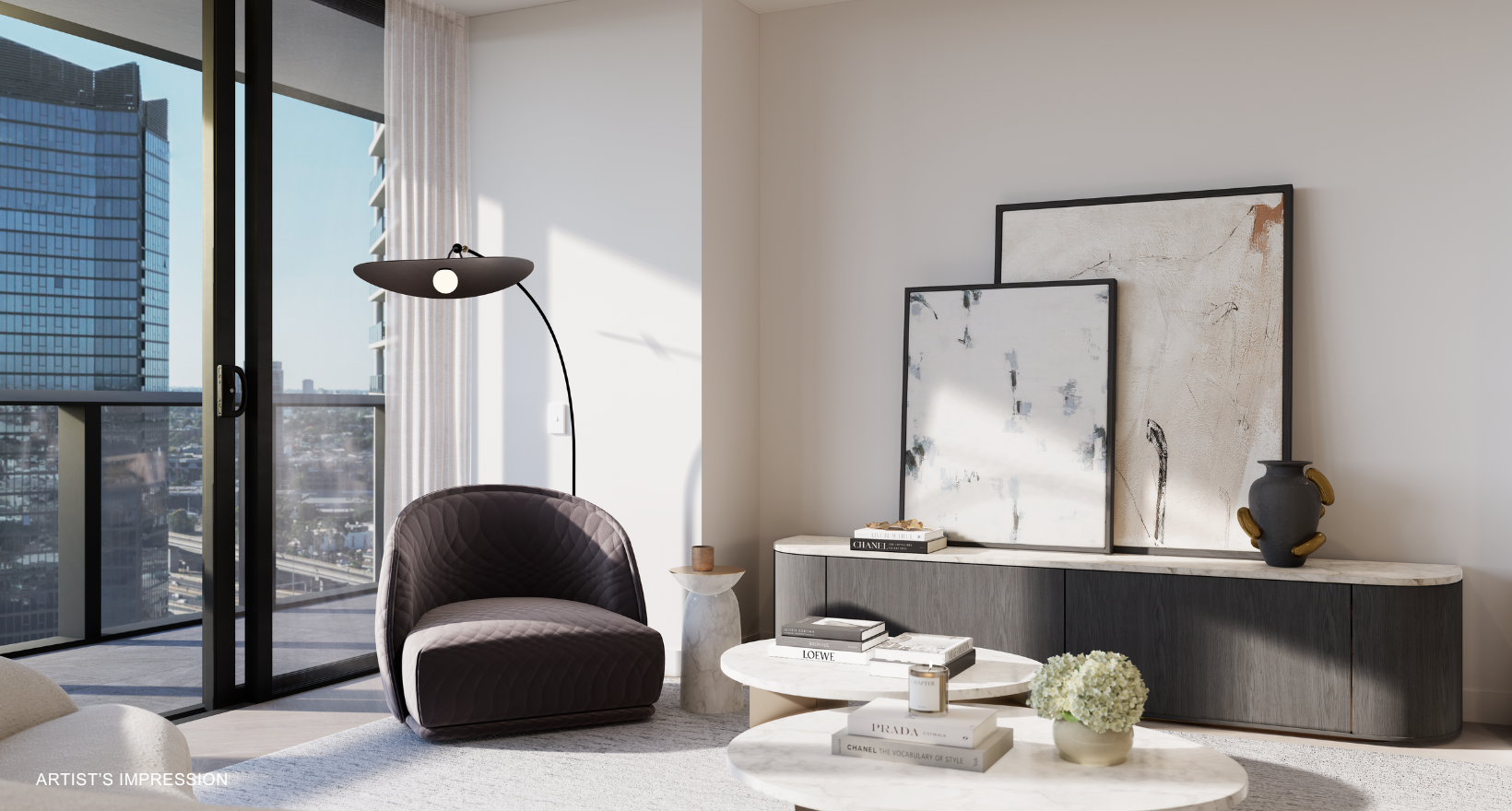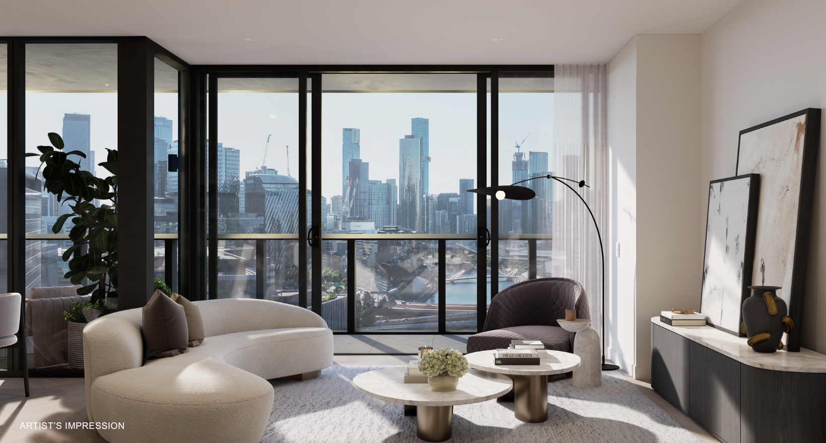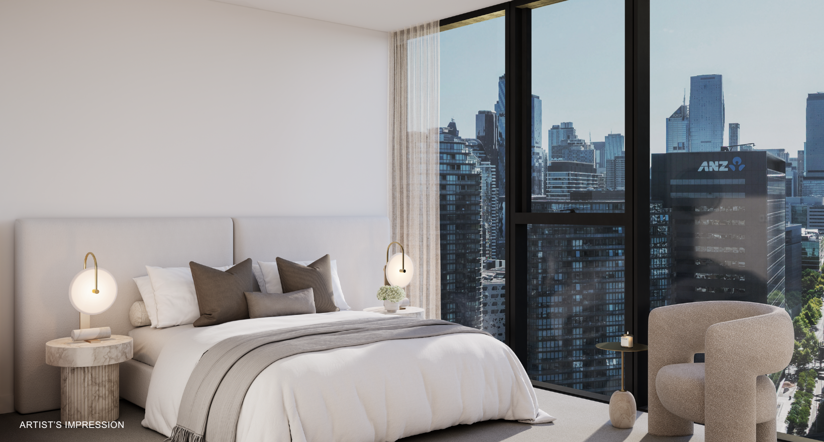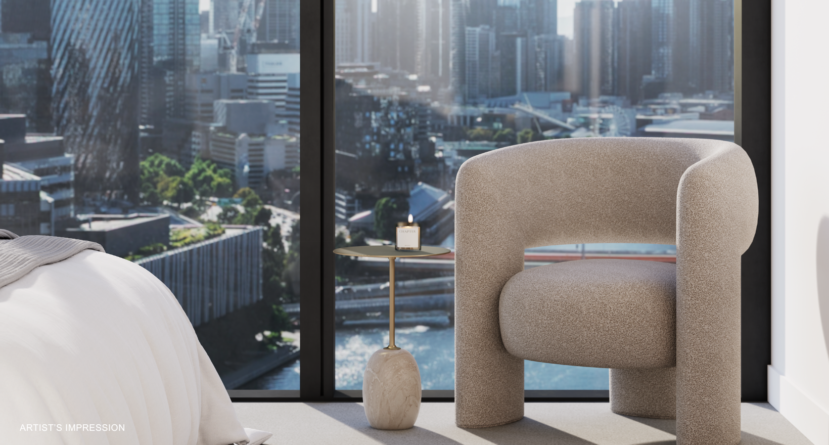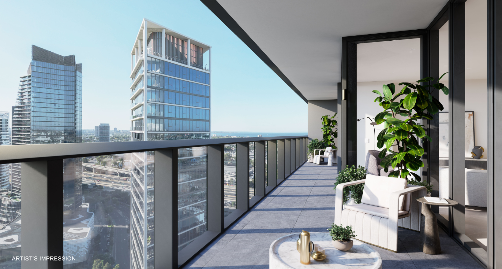 Artist's impression was produced prior to planning approval, statutory approval and commencement of construction and is subject to change. The information, image and artists' impression depicting interiors and exteriors are intended only as a guide and are not to be relied on as representative of the final product or the apartment type advertised. Furnishings are not included. Views depicted in this property listing are indicative only at approximately Level 23 and should not be relied upon as representative of any final views from any particular apartment. Purchasers should make their own enquiries as to the impact of any proposed surrounding development on any views. Photography is correct as at August 2022 and does not represent any future development that may occur in the area. The information provided herein is believed to be correct as at October2025.