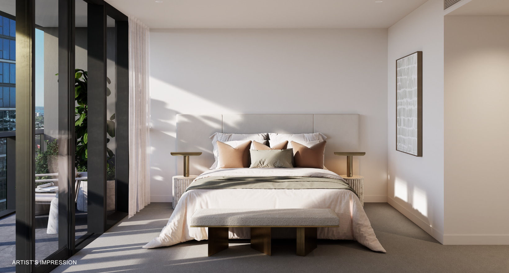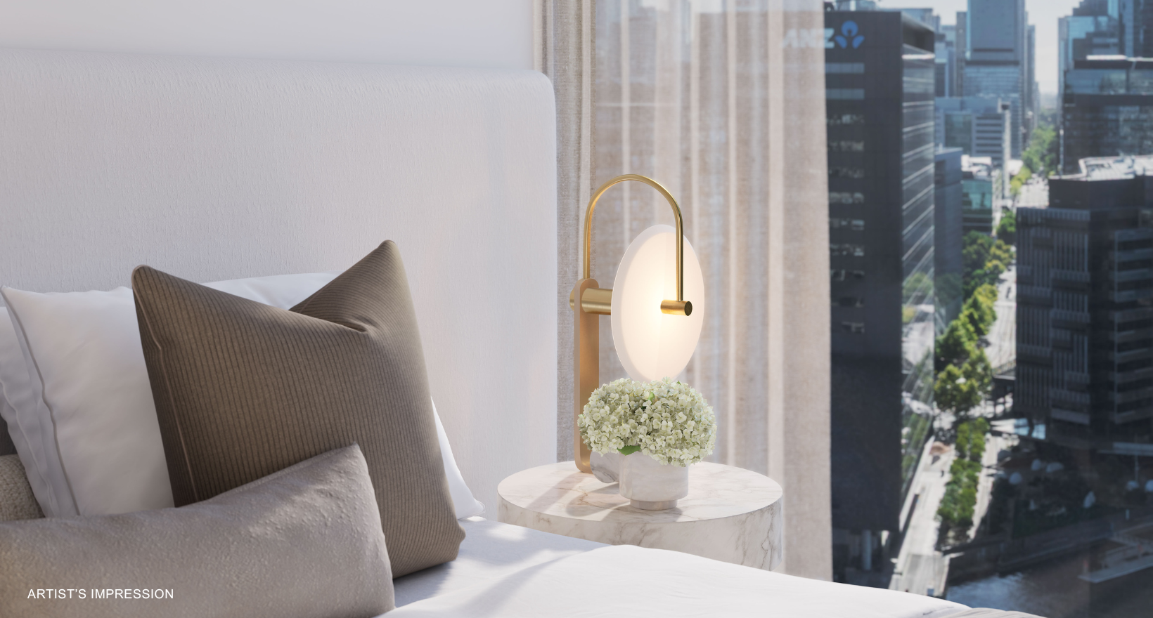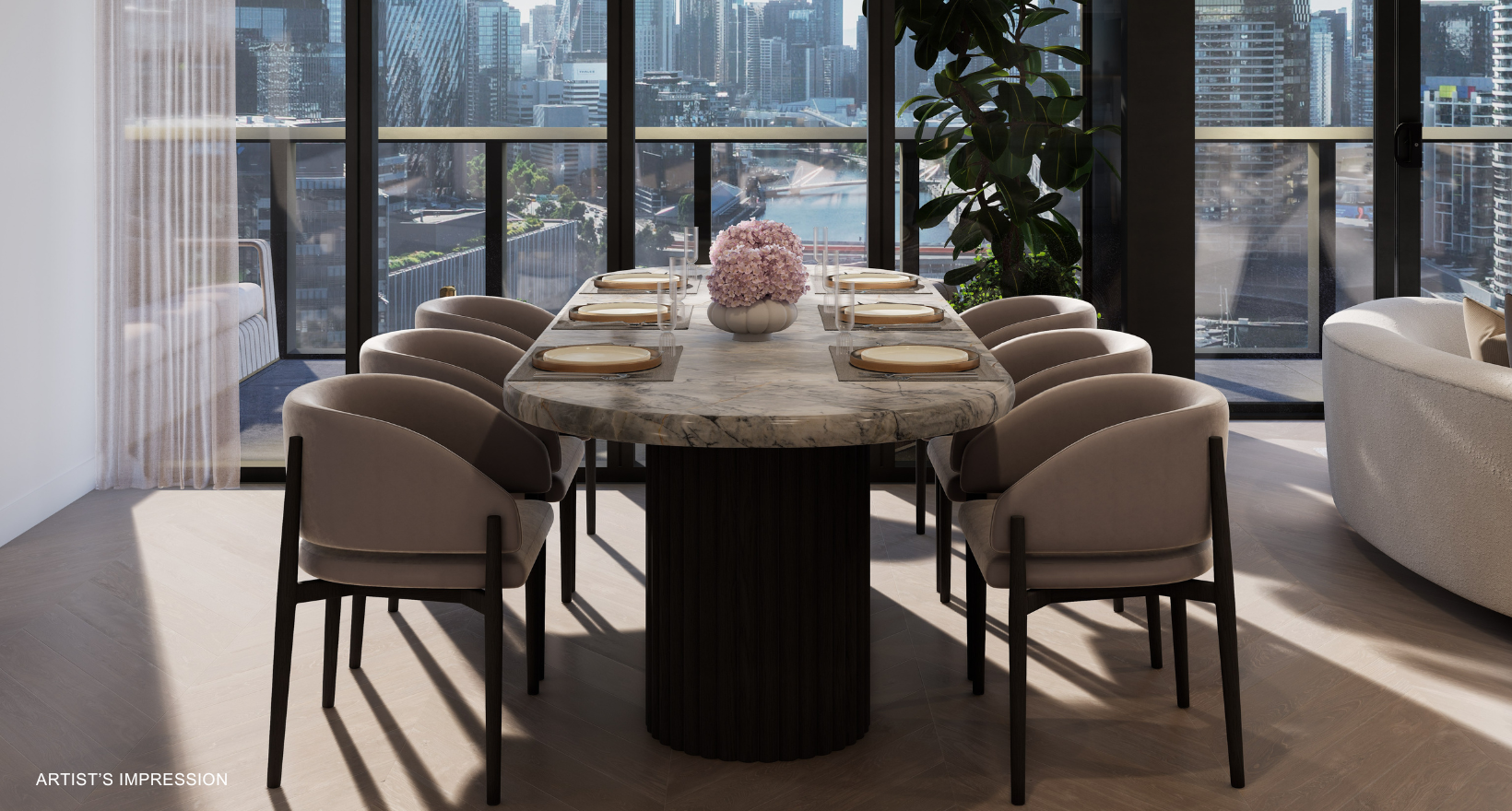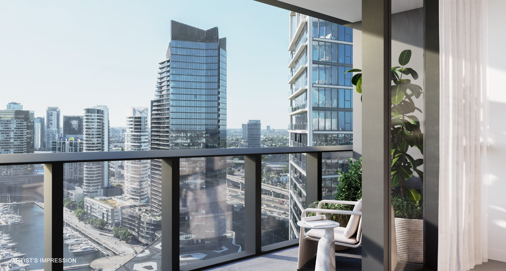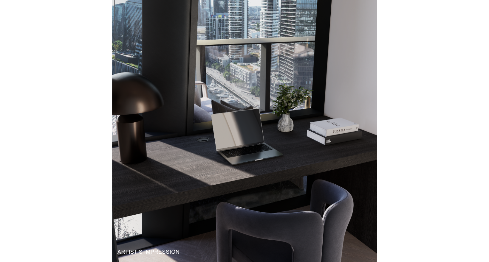 Artist's impression was produced prior to planning approval, statutory approval and commencement of construction and is subject to change. The information, image and artists' impression depicting interiors and exteriors are intended only as a guide and are not to be relied on as representative of the final product or the apartment type advertised. Furnishings are not included. Views depicted in this property listing are indicative only at approximately Level 23 and should not be relied upon as representative of any final views from any particular apartment. Purchasers should make their own enquiries as to the impact of any proposed surrounding development on any views. Photography is correct as at August 2022 and does not represent any future development that may occur in the area. The information provided herein is believed to be correct as at October2025.
