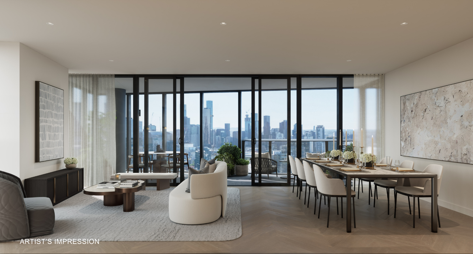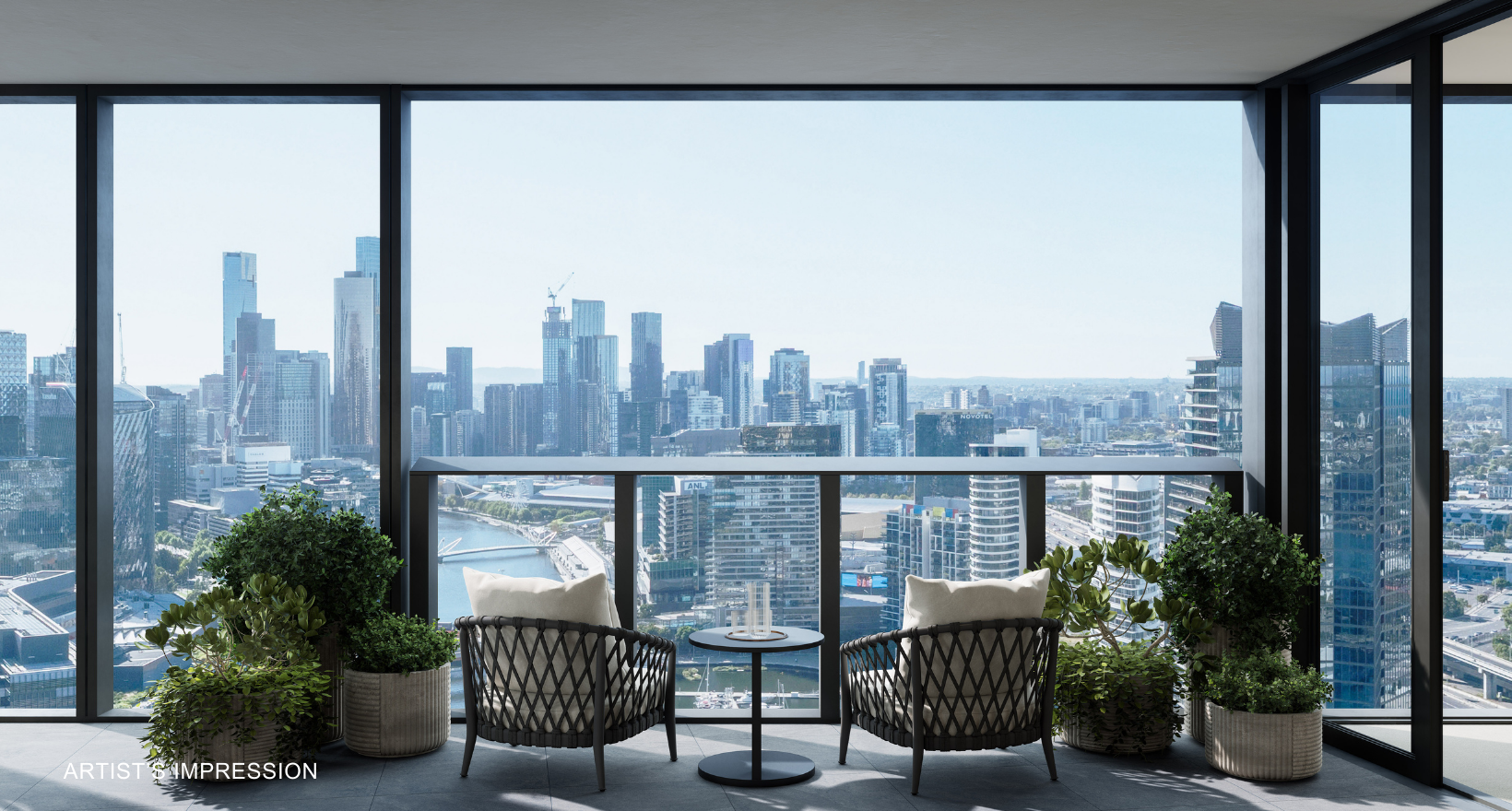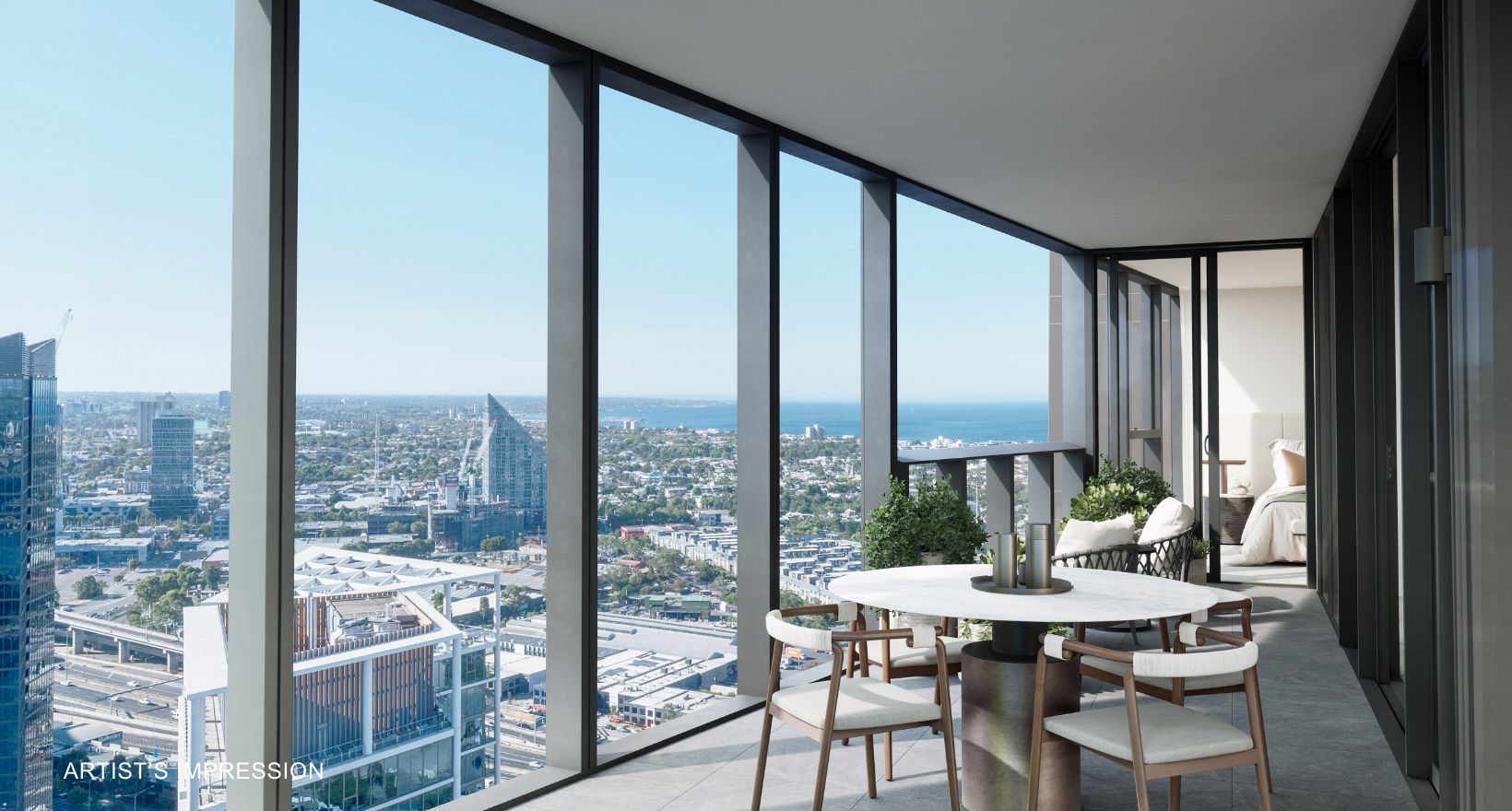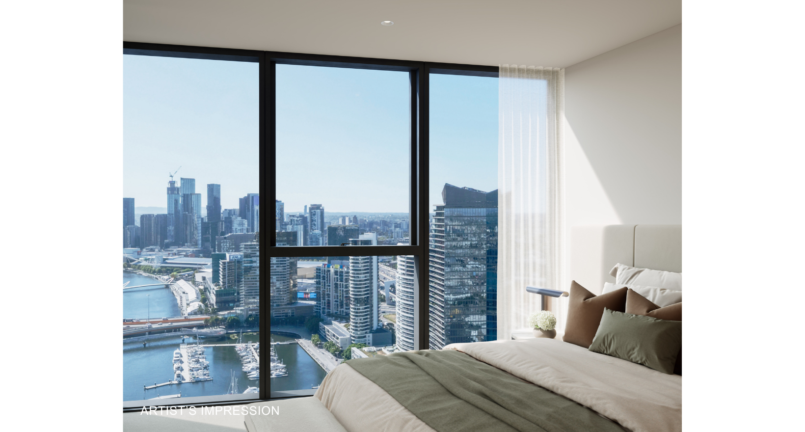 Artist's impression was produced prior to planning approval, statutory approval and commencement of construction and is subject to change. The information, image and artists' impression depicting interiors and exteriors are intended only as a guide and are not to be relied on as representative of the final product or the apartment type advertised. Furnishings are not included. Views depicted in this property listing are indicative only at approximately Level 35 and should not be relied upon as representative of any final views from any particular apartment. Purchasers should make their own enquiries as to the impact of any proposed surrounding development on any views. Photography is correct as at August 2022 and does not represent any future development that may occur in the area. The information provided herein is believed to be correct as at January 2026.