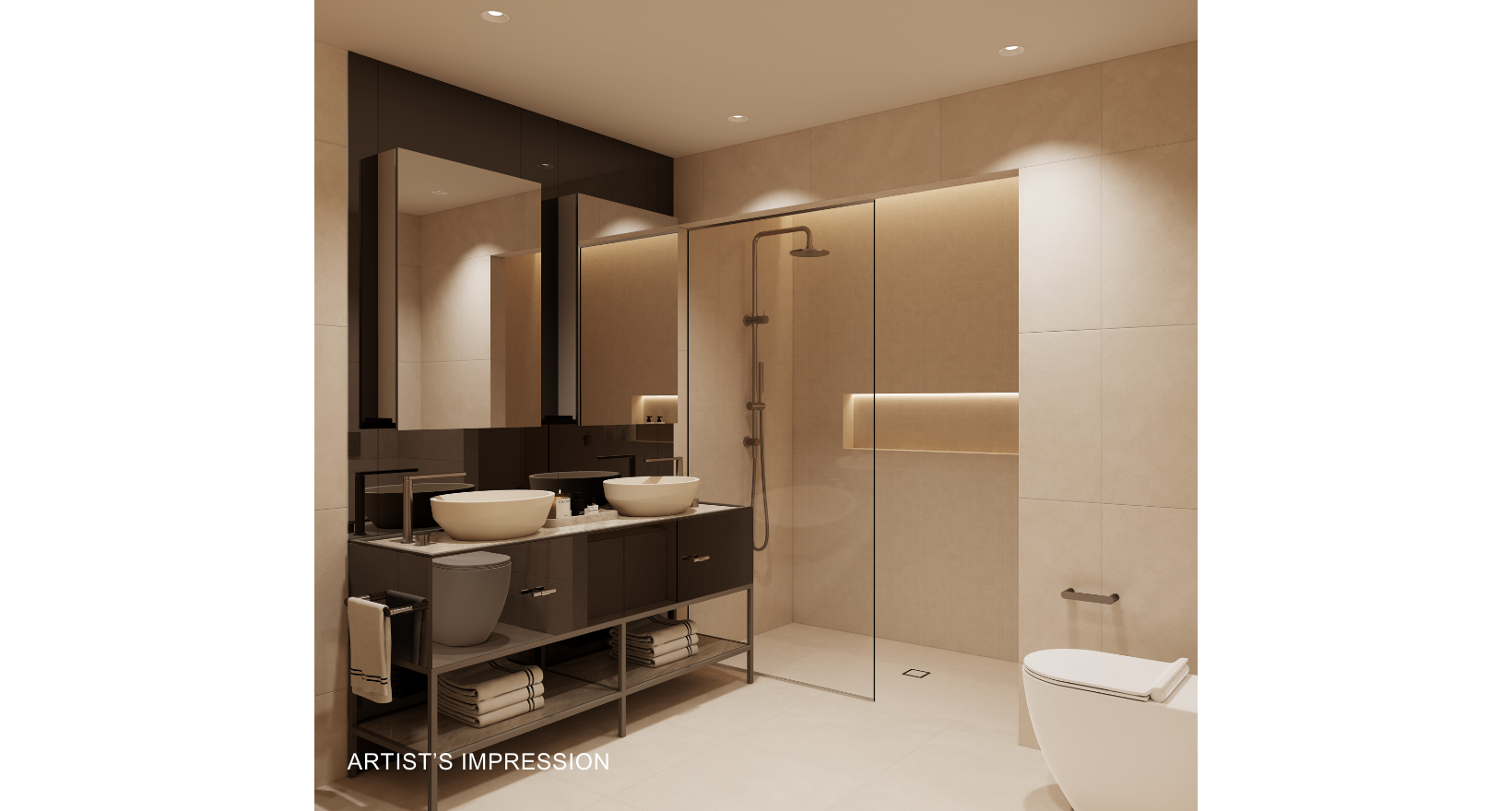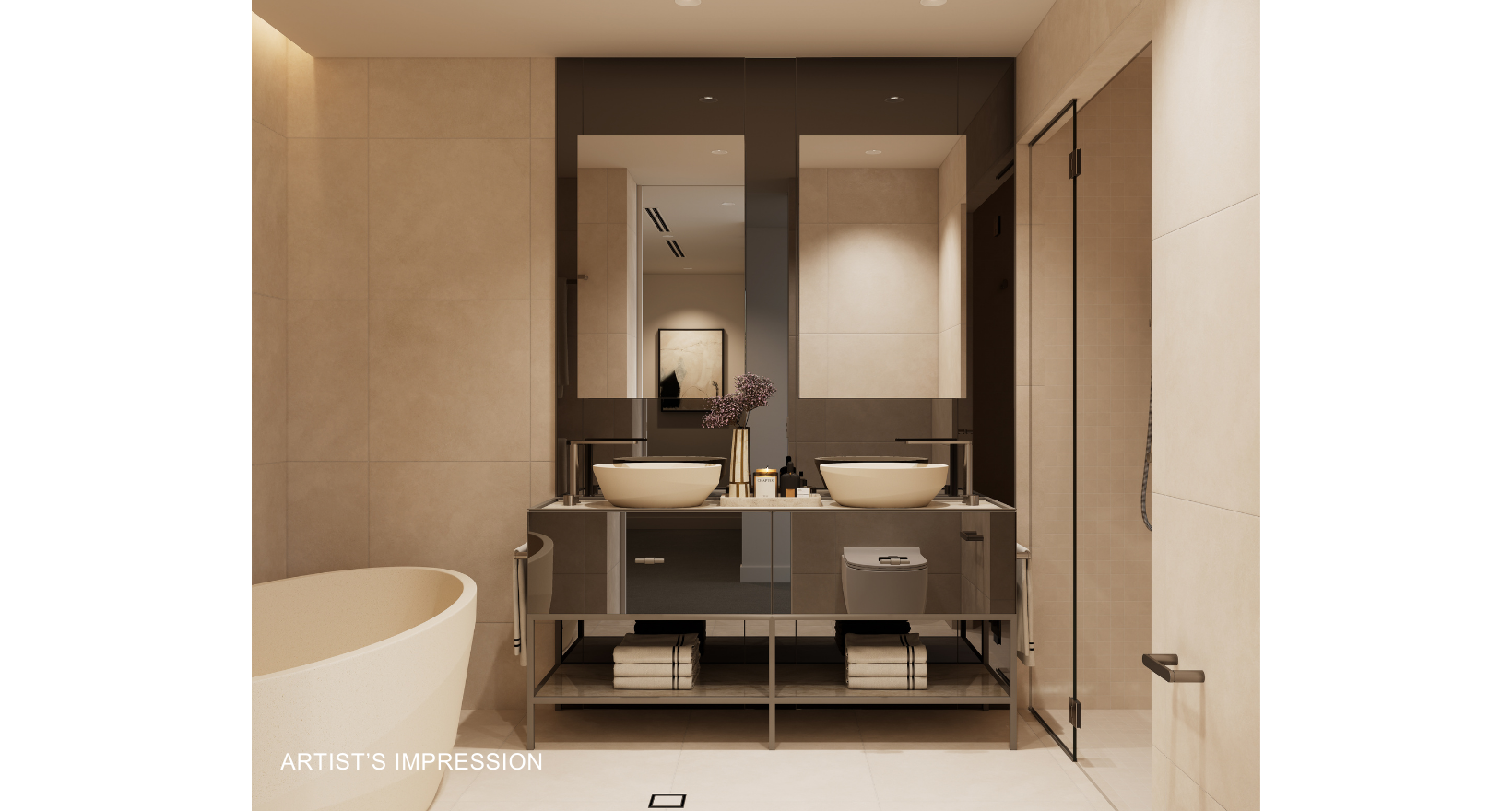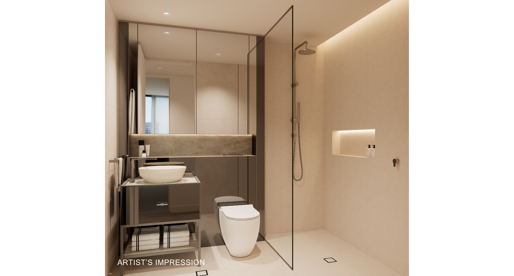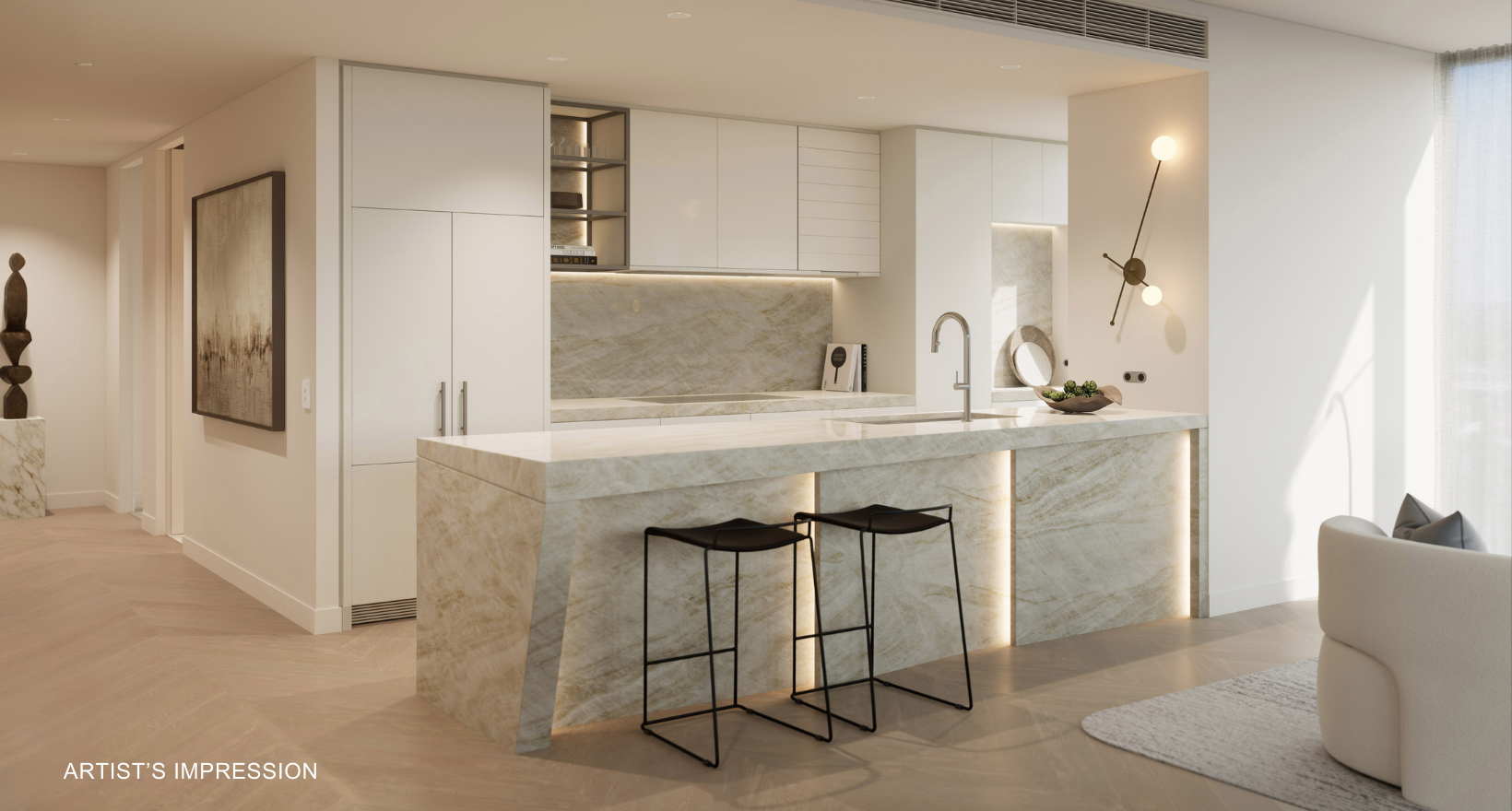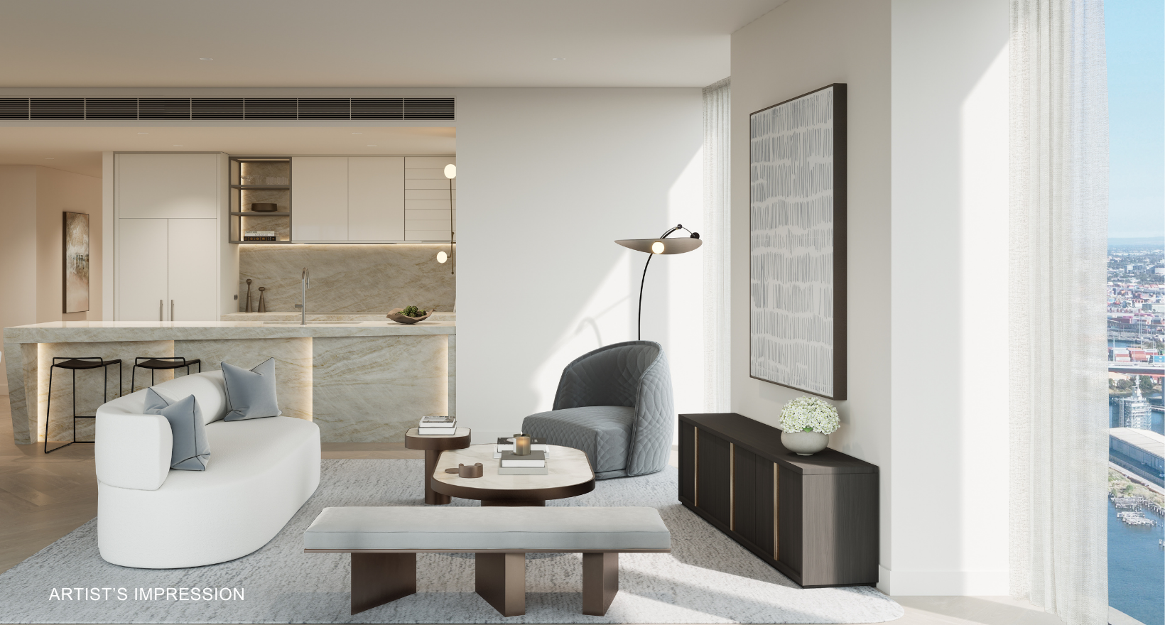 Artist's impression was produced prior to planning approval, statutory approval and commencement of construction and is subject to change. The information, image and artists' impression depicting interiors and exteriors are intended only as a guide and are not to be relied on as representative of the final product or the apartment type advertised. Furnishings are not included. Views depicted in this property listing are indicative only at approximately Level 35 and should not be relied upon as representative of any final views from any particular apartment. Purchasers should make their own enquiries as to the impact of any proposed surrounding development on any views. Photography is correct as at August 2022 and does not represent any future development that may occur in the area. The information provided herein is believed to be correct as at January 2026.
